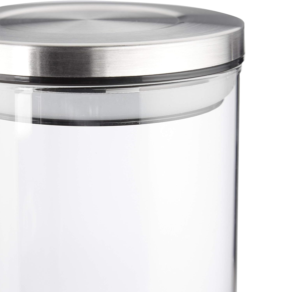 Capacità: 1 litro - Materiale corpo: vetro trasparente - Materiale coperchio: acciaio - Chiusura: ermetica a vite con silicone salva‑freschezza - Utilizzo: alimenti secchi, spezie, legumi, biscotti, farine - Pulizia: corpo vetro lavabile in lavastoviglie; coperchio a mano -