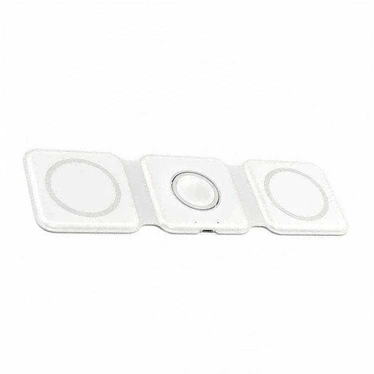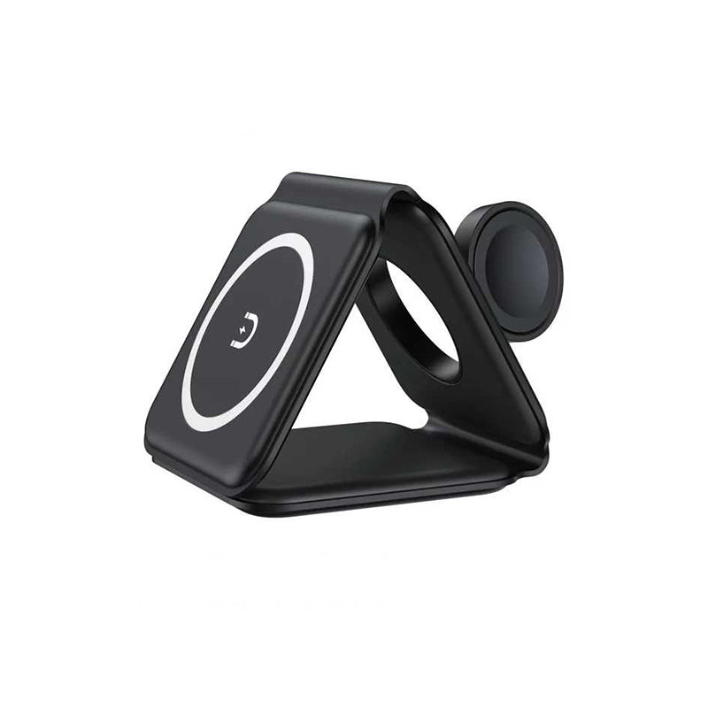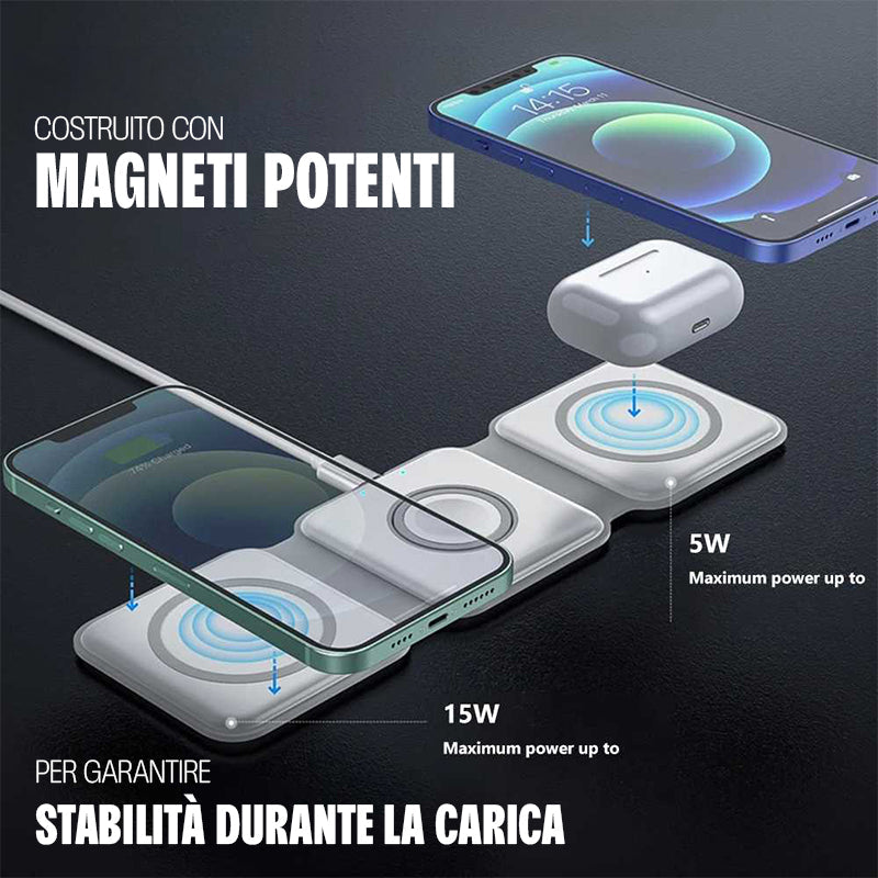 Ricarica iPhone, AirPods e Apple Watch simultaneamente con questo supporto wireless magnetico tutto-in-uno. Design pieghevole e compatto per un utilizzo facile in casa, ufficio o in viaggio.