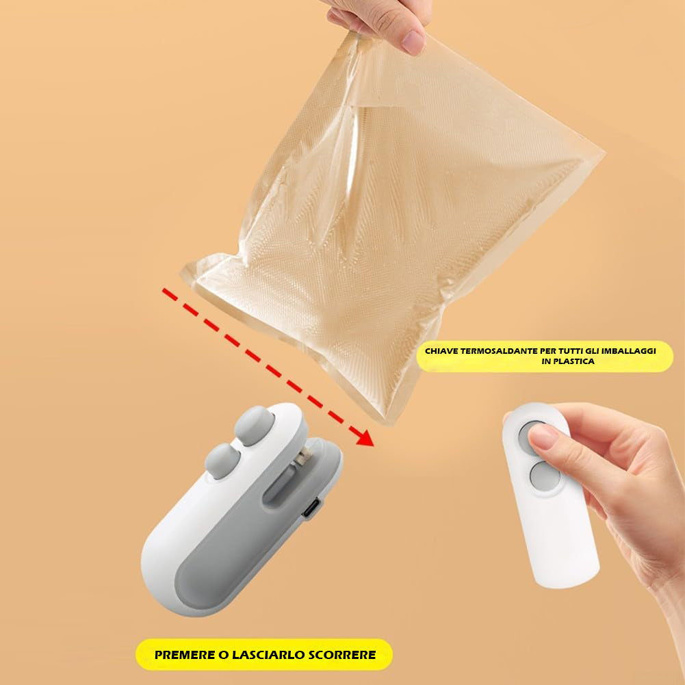 Mini Sigillatori Termici Portatile 2 in 1 (Sigilla e Taglia) Ricaricabile USB, Uso Domestico, Sigillatore Per Ogni Tipo Di Busta