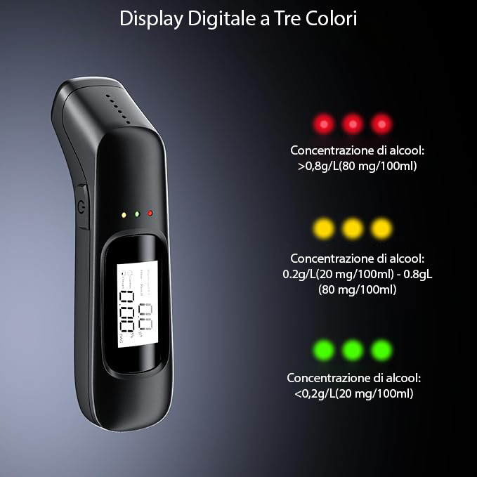 Equipaggiato con un sistema di avvisi a tre colori, l'etilometro copre un range di test di 0,00%0,19%BAC/0,01,9 g/l. Se il tasso alcolico rilevato supera lo 0,03% BAC o 0,30 g/l, il dispositivo emette un segnale acustico continuo avvertendo i conducenti di non mettersi alla guida.