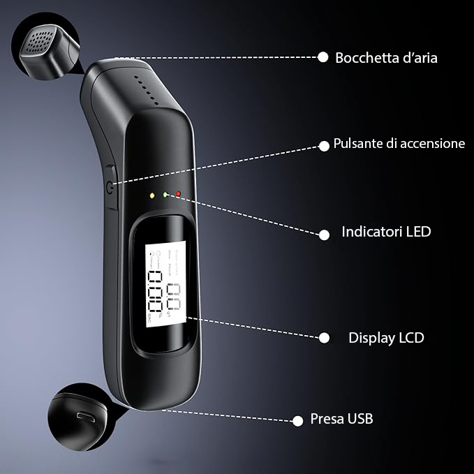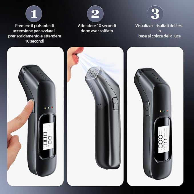 Grazie al design intuitivo, utilizzare l'etilometro non potrebbe essere più semplice. Alla prima accensione, è sufficiente caricare completamente il dispositivo con il cavo di ricarica USB in dotazione. Quando il LED rosso si spegne, il dispositivo è pronto. Per effettuare una misurazione, basta attendere 15 secondi per il riscaldamento, poi soffiare nel tester per 5 secondi e attendere altri 3 secondi per visualizzare il risultato sul display LCD.