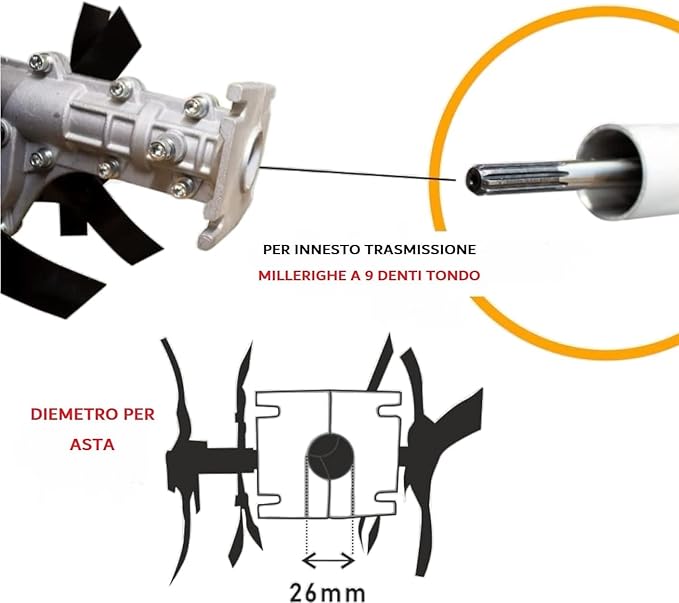 Compatibilità: Asta di trasmissione Millerighe 9 denti tonda oppure Asta di trasmissione quadrata.