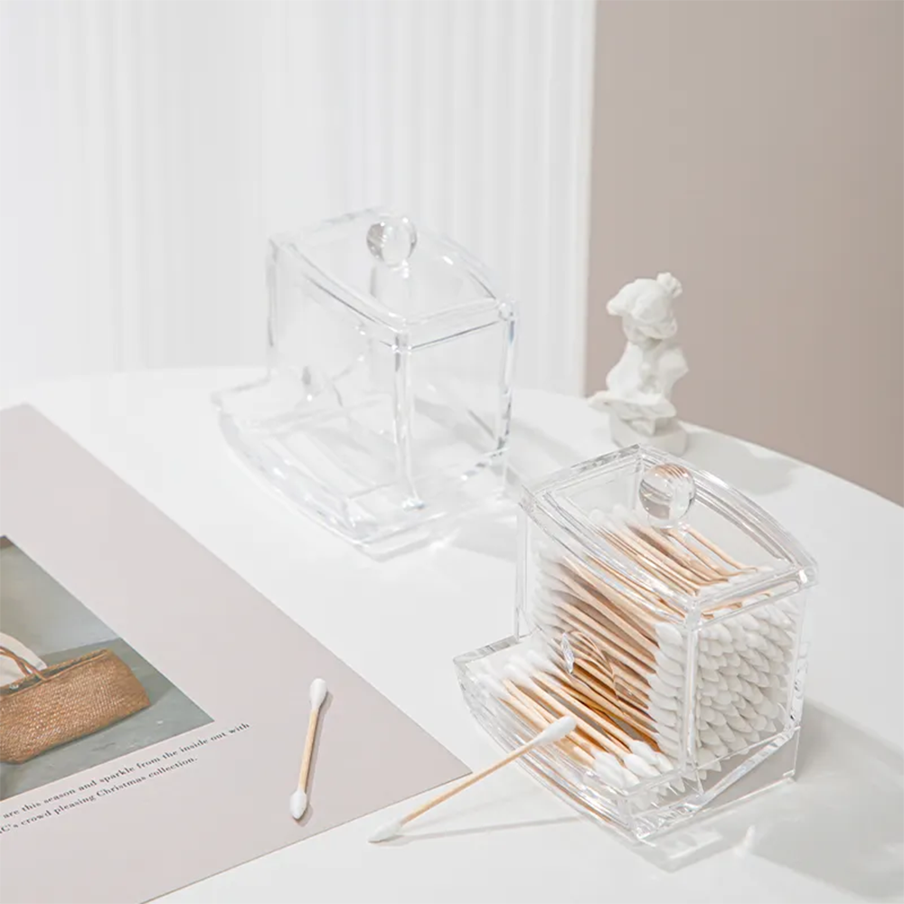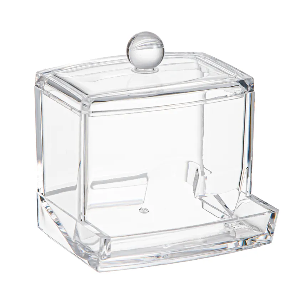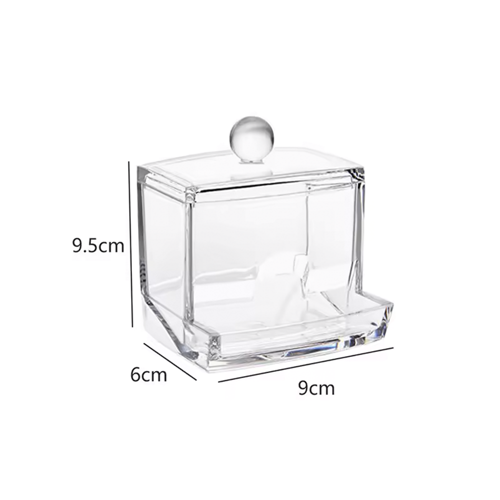 Dimensioni: 12 × 10 × 9 cm (L × P × H) - Compartimenti: 1 vano principale + coperchio rimovibile - Colore: trasparente - Utilizzo: cotton fioc, batuffoli cotone, rossetti, gioielli, accessori skincare - Pulizia: panno umido o acqua tiepida con sapone neutro
