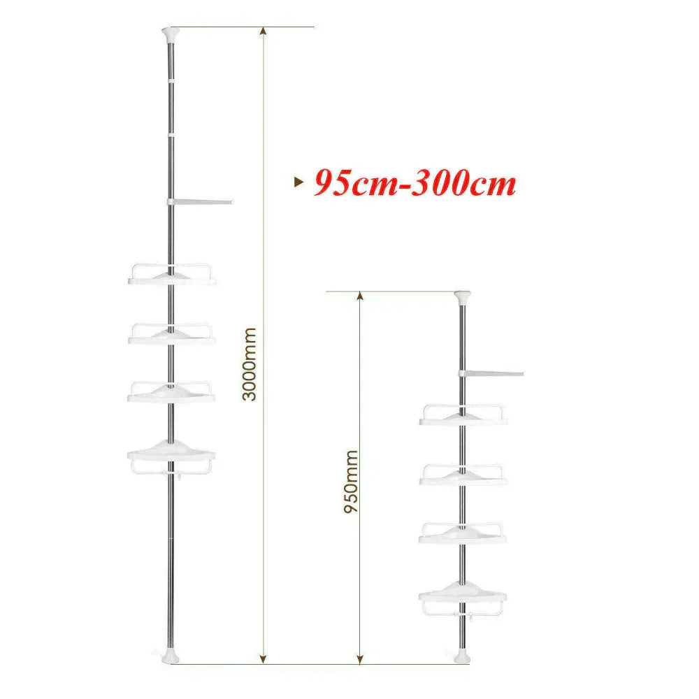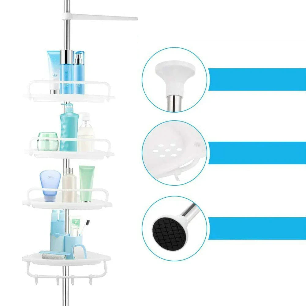 Grande Capacità, Questo palo di tensione a 4 livelli bianco è progettato per contenere tutti gli elementi essenziali per la doccia e il bagno, inclusi shampoo, balsamo, rasoi, salviette, sapone, ecc.