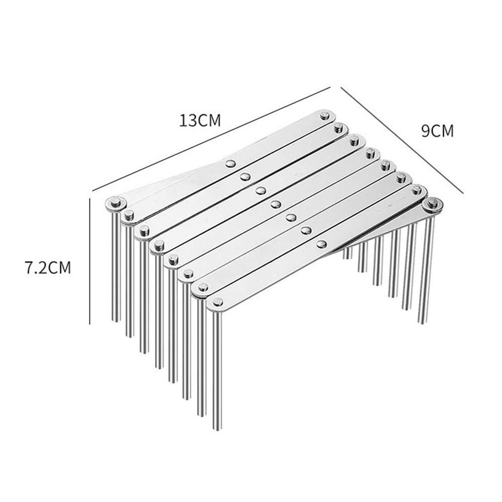 Materiale: Acciaio inox ad alta durezza – Colore: Argento – Dimensioni chiuso: 13 x 5,5 x 7,5 cm – Dimensioni aperto: 48,7 x 13 x 7,5 cm – Peso: leggero e maneggevole – Funzioni: scolapiatti, porta coperchi, supporto taglieri, porta utensili, porta bicchieri, supporto smartphone – Installazione: nessuna, pronto all’uso – Uso: cucina, campeggio, viaggi, tavolo, muro