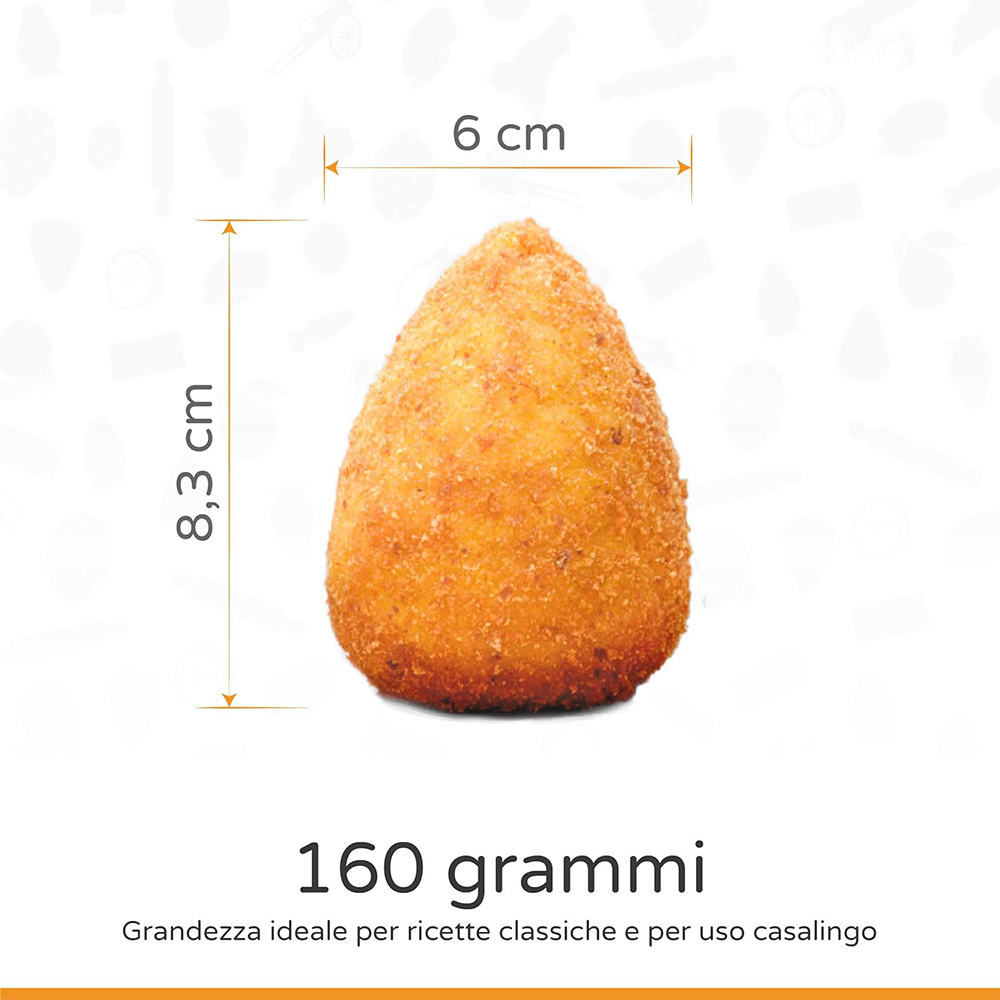 Tipo: Stampo per arancini a punta – Capacità: 160g – Dimensioni arancino: 6 cm (diametro), 8 cm (altezza) – Materiale: Plastica alimentare – Utilizzo: Arancini, crocchette, polpette – Ideale per: Ricette con ragù, piselli, formaggio o varianti creative