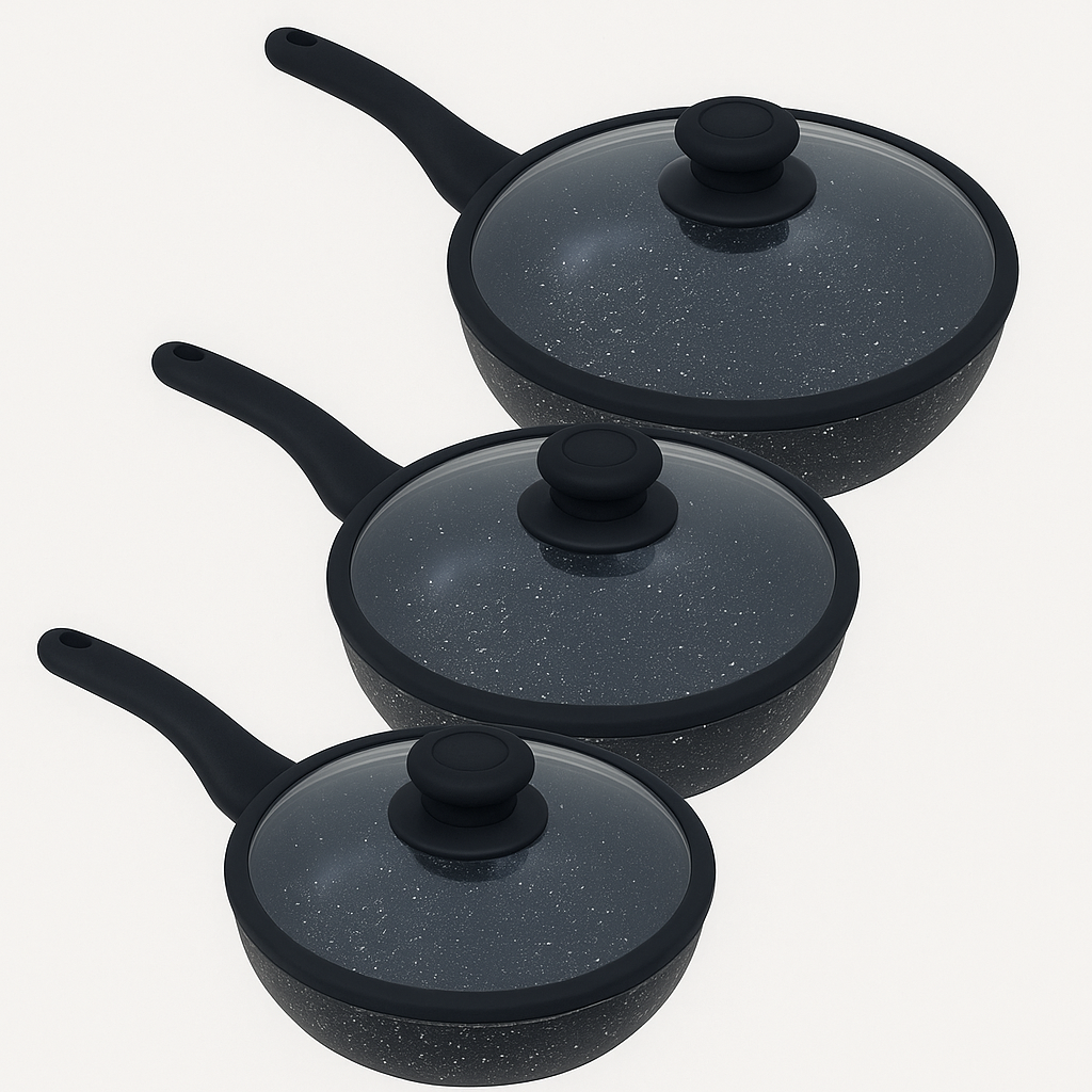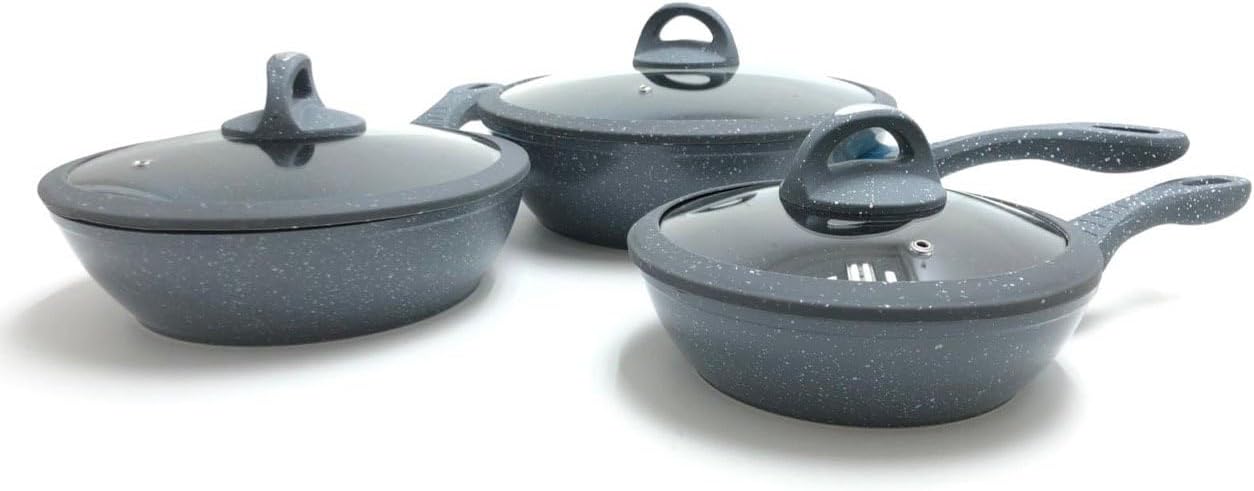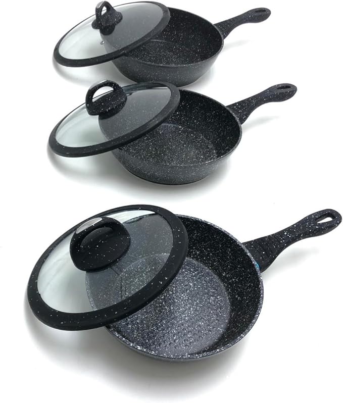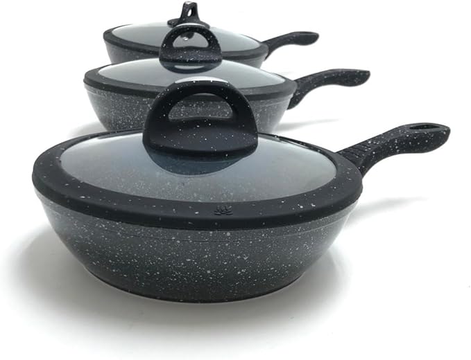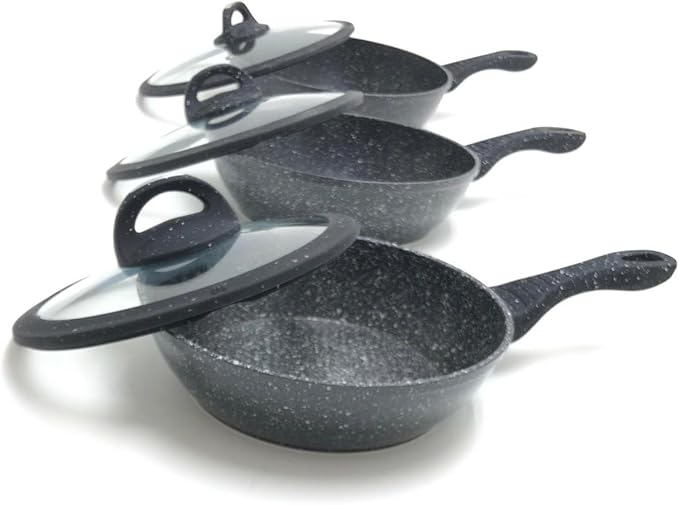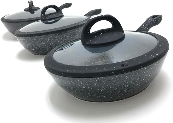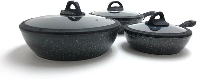 Tipo alto in pietra lavica composte da 3 padelle e 3 coperchi con manici particolari, doppie antiaderenti per una cucina sana ? con piano cottura adatto sia sulle cucine a gas che su quelle ad induzione