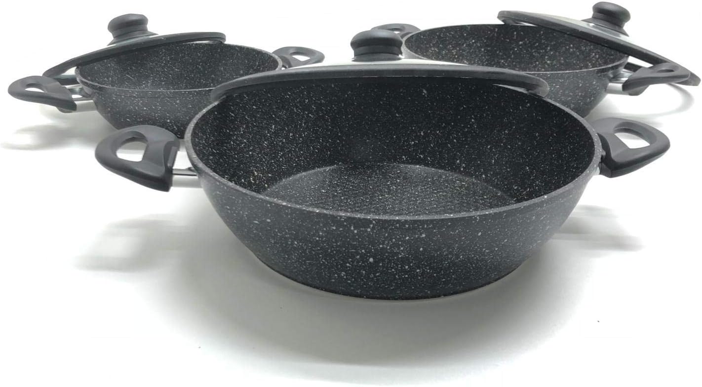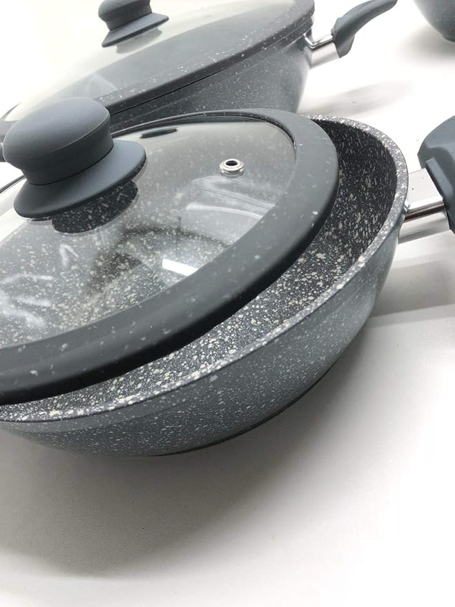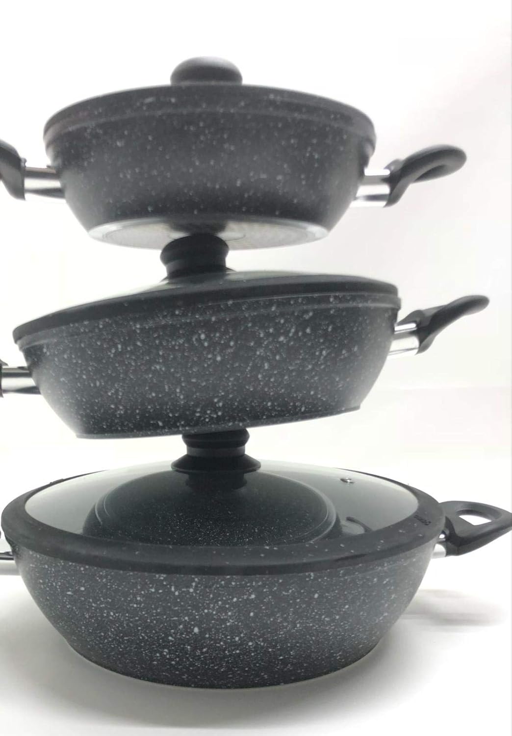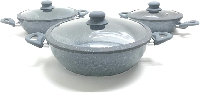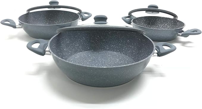 Tipo alto in pietra lavica composte da 3 padelle e 3 coperchi con manici particolari, doppie antiaderenti per una cucina sana ? con piano cottura adatto sia sulle cucine a gas che su quelle ad induzione