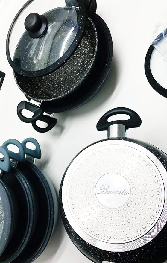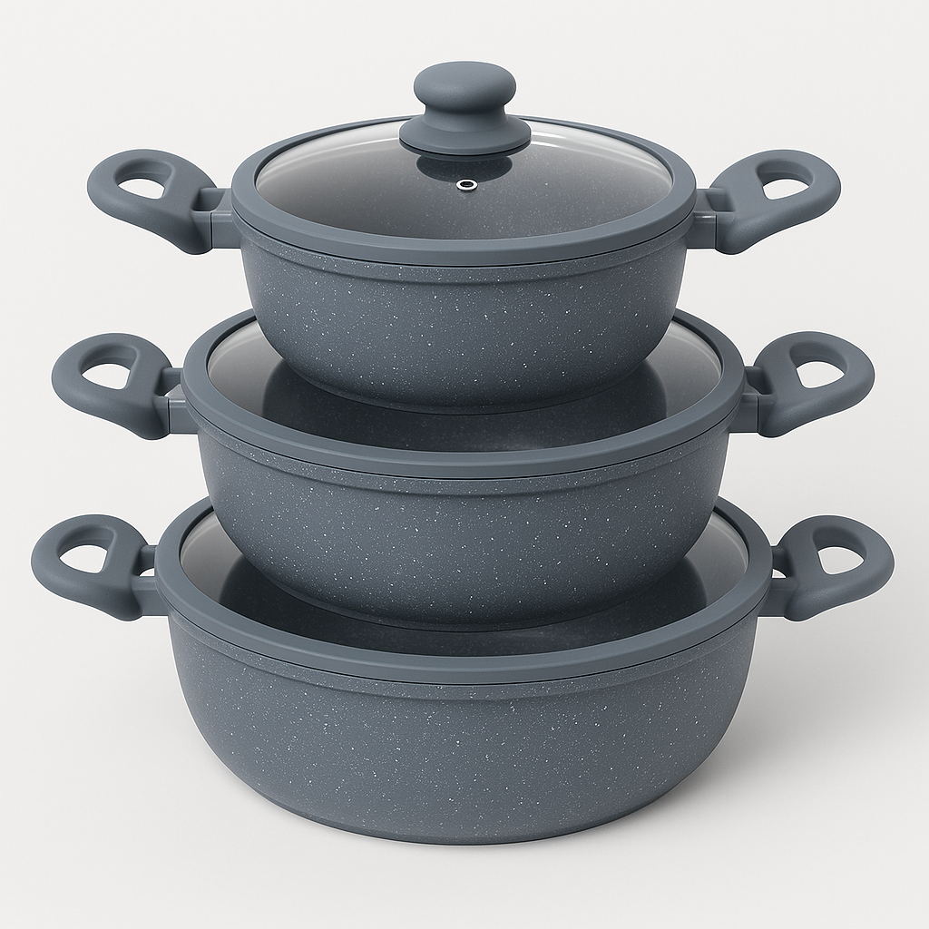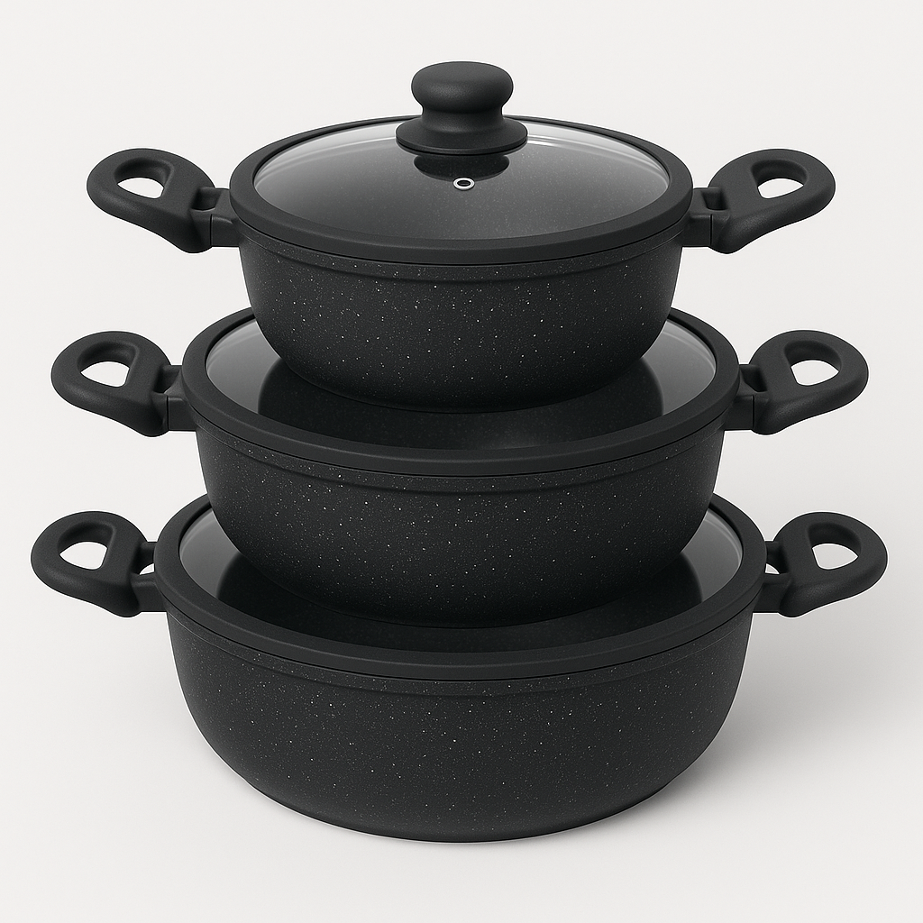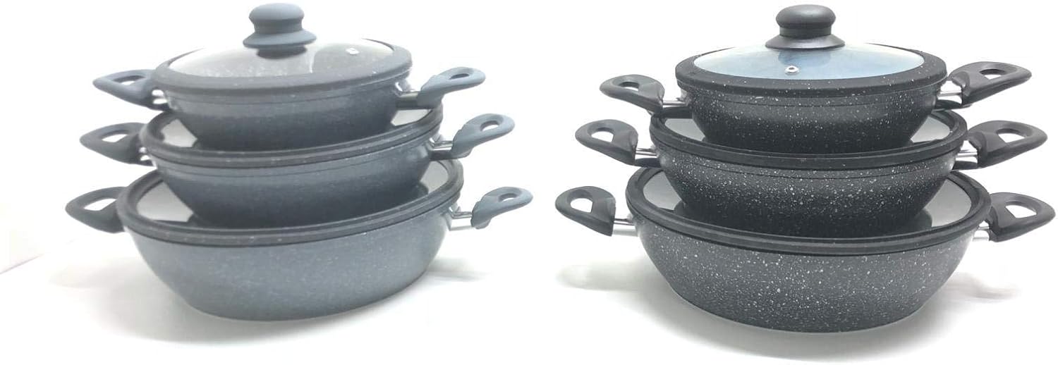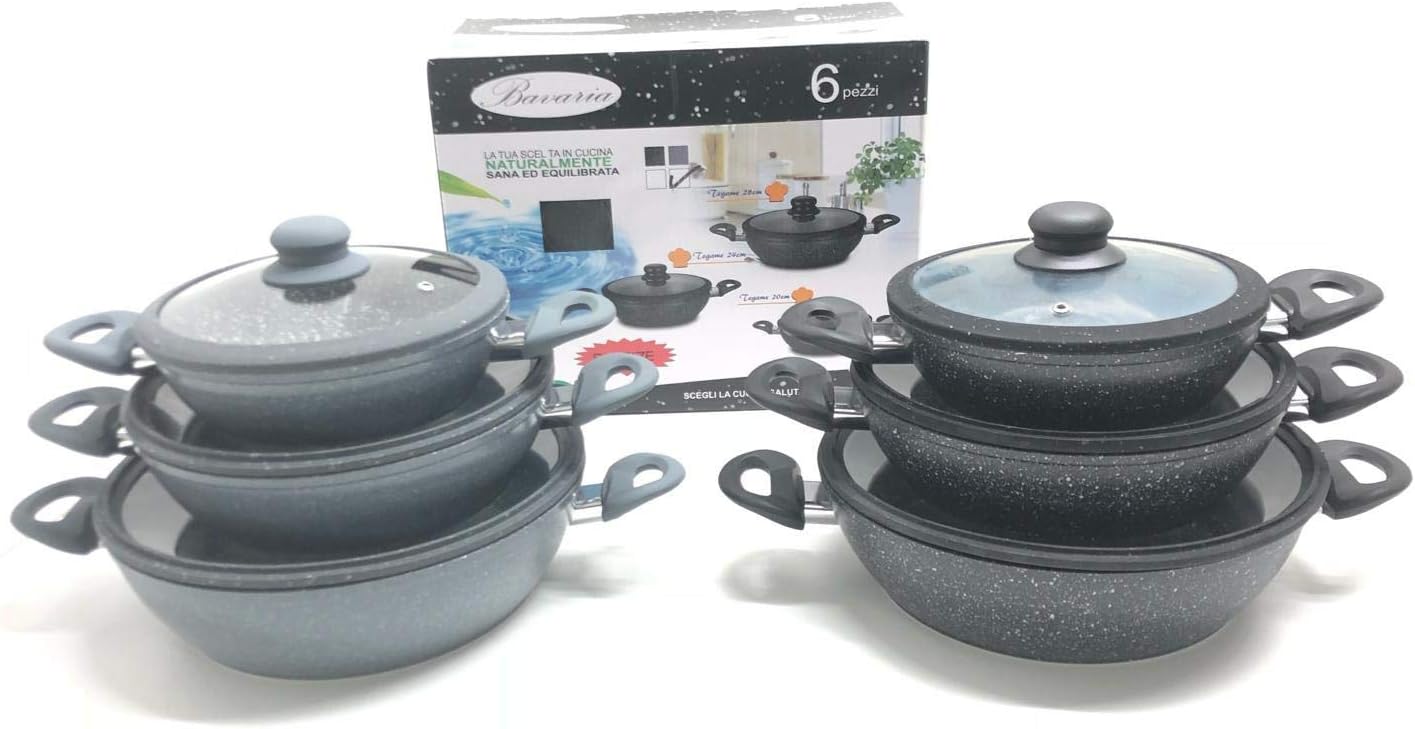 Tipo alto in pietra lavica composte da 3 padelle e 3 coperchi con manici particolari, doppie antiaderenti per una cucina sana ? con piano cottura adatto sia sulle cucine a gas che su quelle ad induzione